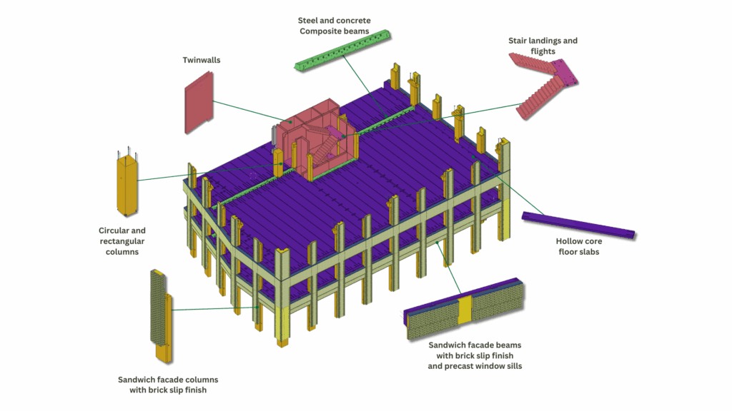 In a complex urban London location with tight deadlines, DEPROM provided a precast superstructure with integrated brick-slip façades. The project was delivered safely and on time, optimising logistics, reducing on-site workforce, and minimising disruption.